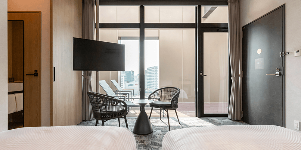 宽敞的房间加上窗前的屋顶阳台,能尽享从高层眺望和舒适的时间。浴室带有浴缸,为您提供舒适的住宿。